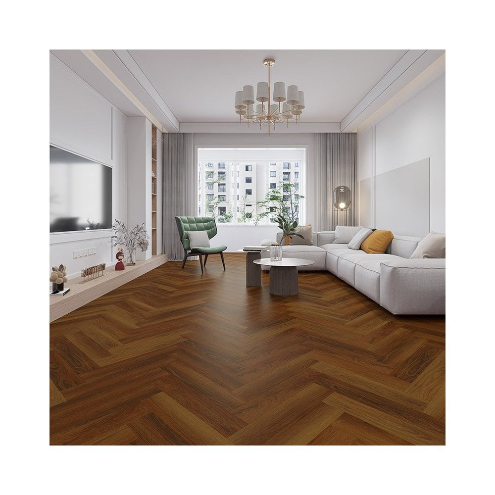 The Cherokee Oak Herringbone LVT features rich rustic tones and intricate woodgrain, adding character to kitchens, lounges, bathrooms & commercial spaces